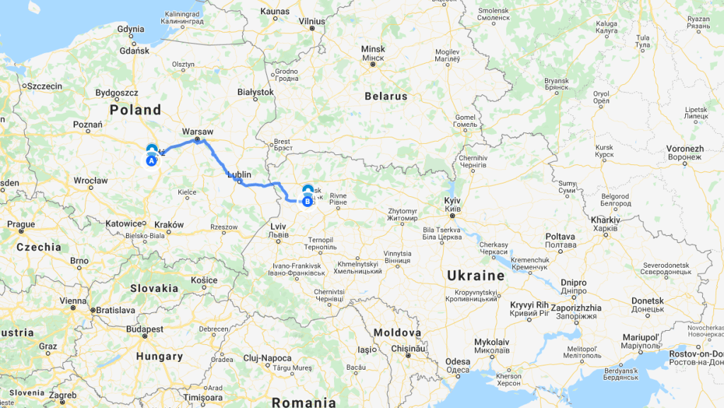 Map 1: Map of journey on a current map of Poland and Ukraine, created 21 Mar 2021 using Google MyMaps; Volhynia of the late nineteenth century spanned southeast Poland and northeast Ukraine