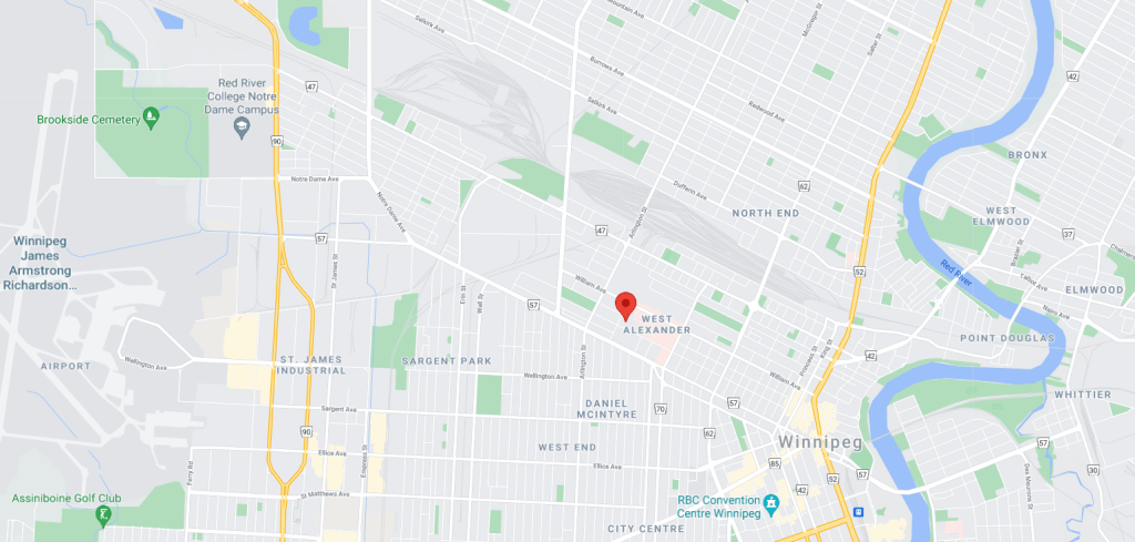 Map of Winnipeg showing location of Bannatyne Avenue, where the Rempel family lived. The gray lines represent the Canadian Pacific Railway yards, the North End indicated above it; courtesy of Google Maps (captured 31 May 2021)