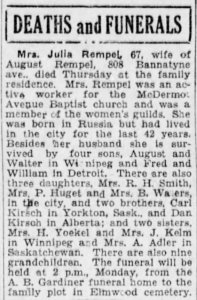 Mrs. Julia Rempel, 67, wife of August Rempel, of 808 Bannatyne Ave., died Thursday at the family residence. Mrs. Rempel was an active worker for McDermot Avenue Baptist Church and was a member of the women’s guilds. She was born in Russia but had lived in the city for the last 42 years. Besides her husband she is survived by four sons, August and Walter in Winnipeg and Fred and William in Detroit. There are also three daughters, Mrs. R. H. Smith, Mrs. P. Huget and Mrs. B. Waters in the city, and two brothers, Carl Kirsch in Yorkton, Sask., and Dan Kirsch in Alberta; and two sisters, Mrs. H. Yoekel and Mrs. J. Kelm in Winnipeg and Mrs. A Adler in Saskatchewan. There are also nine grandchildren. The funeral will be held at 2 pm, Monday, from A. B. Gardiner funeral home to the family plot in Elmwood cemetery.[40]