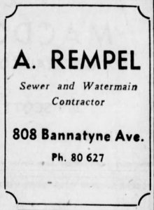 [37] “Augustus Rempel” in Henderson’s Winnipeg Directory, 1922, accessed 31 May 2021 through Ancestry [Note: August is working as a contractor; Violet Rempel (dressmaker) and Walter Rempel (fire department clerk) also live at home in 1922]