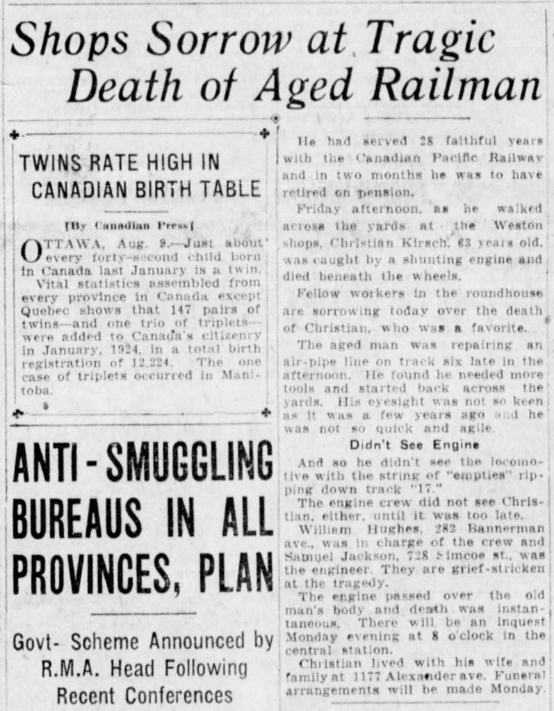 [1] “Danie [sic] Kirsch” from Canadian Passenger Lists, 1865-1935, accessed 16 Nov 2020 through Ancestry